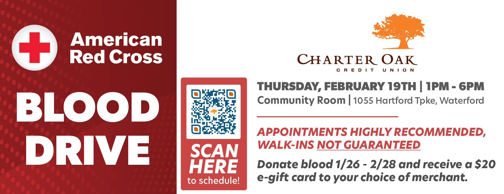 Charter Oak Federal Credit Union is partnering with American Red Cross to host a blood drive. Appointments can be made here.