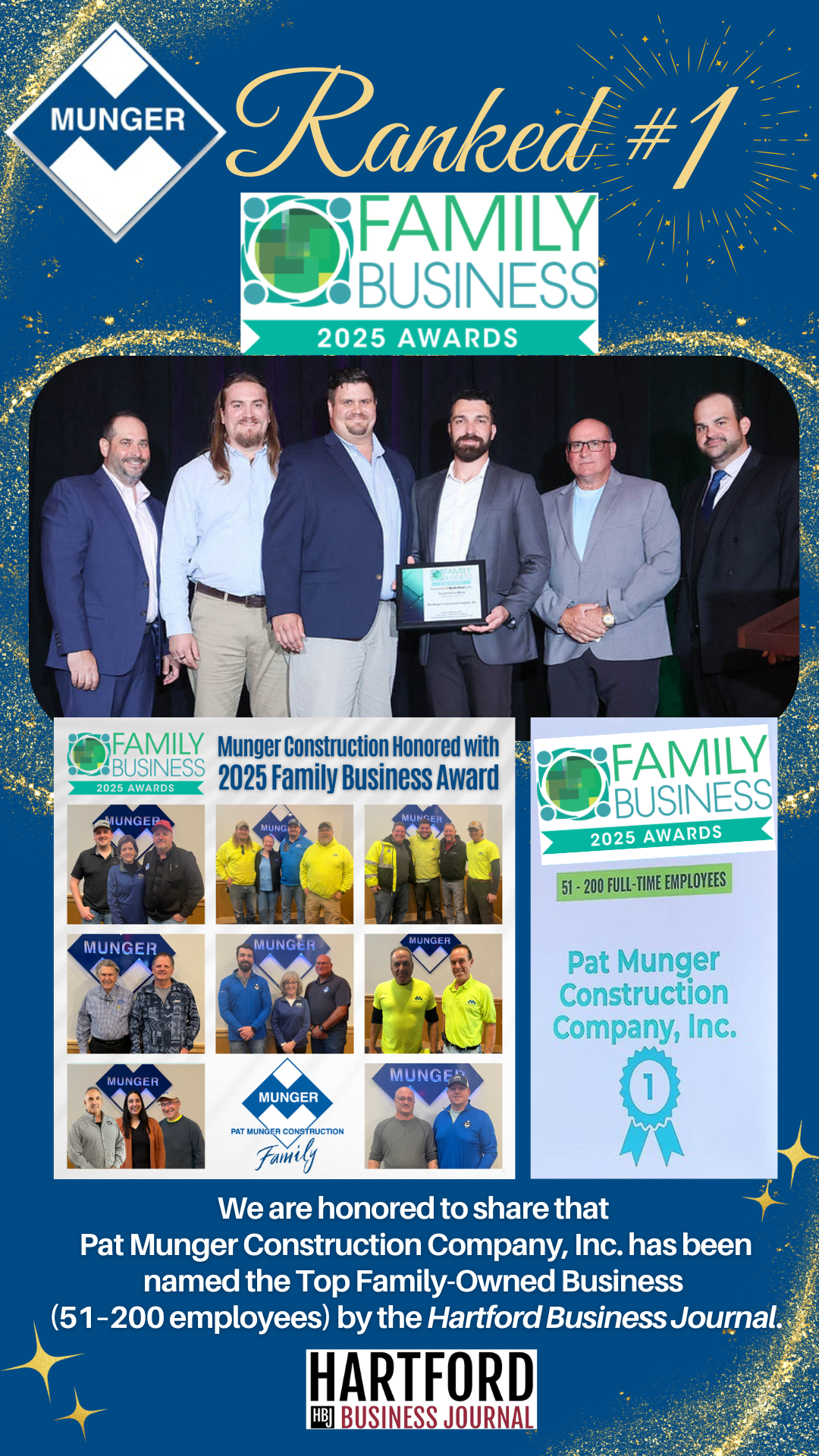Pat Munger Construction Company, Inc. is proud to announce it has been named the #1 Top Family-Owned Business in the 51–200 full-time employee category at the 2025 Top Family Business Awards, presented by the Hartford Business Journal. The announcement was made during a celebration at Farmington Gardens on Thursday, June 12, where family businesses from across the state came together to recognize legacy, leadership, and long-term impact. Munger Construction was honored for its multigenerational workforce, commitment to excellence, and its continued role in shaping Connecticut’s commercial landscape. “This recognition honors everyone who has helped build this company — not just the families by name, but the larger Munger family we've grown together,” said David A. DeMaio, President of Pat Munger Construction Company, Inc. “When people show up with care, pride, and a commitment to one another, you create more than a company. You create a legacy.” Founded in 1968 by Phillip “Pat” Munger, the company has grown from a shell-only contractor into one of Connecticut’s most respected full-service design-build general contractors. Today, the company is led by David A. DeMaio, along with Pamela DeMaio (Vice President) and their son James DeMaio (Vice President of Business Operations). What truly sets Munger apart is the people who make up its in-house team. Currently, 23 of the total 85 employees represent 9 multigenerational families, contributing a combined 325 years of service to the company. This depth of experience and unity reinforces Munger’s reputation for quality, consistency, and long-term client relationships. In addition to its core services, Munger Construction owns and operates Industrial Building Systems (IBS), a pre-engineered metal building subcontractor supporting projects throughout Connecticut and the Northeast. As the company continues to grow, its focus remains on meaningful partnerships, professional development, and carrying forward a legacy of craftsmanship and care. About Pat Munger Construction Company, Inc. Since 1968, Munger has delivered experiences that consistently exceed commercial clients' expectations by providing value-engineered solutions that integrate advanced technology and industry-leading products. A high value-to-cost ratio empowers clients to achieve their business goals while adhering to their principles and fostering connections with their communities. By integrating architecture, engineering, and design-build practices with solid core values and a highly effective Proven Process, Munger builds lasting relationships with clients, employees, partners, and the local community. For more information, visit https://mungerconstruction.com/. Media Contact : Liz Tullo, Marketing Manager, ltullo@mungerconstruction.com